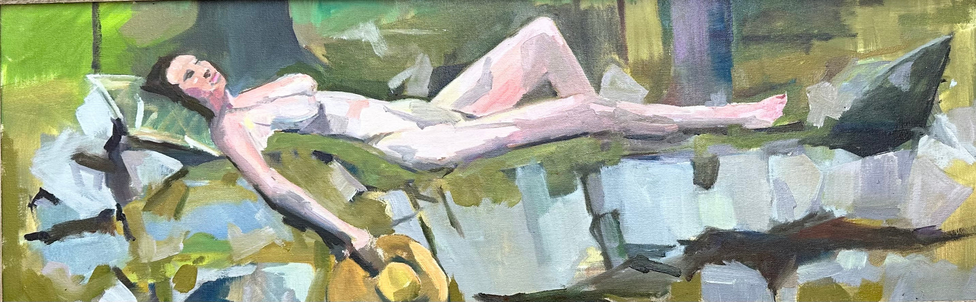 A figure rests in luminous stillness. Her form dissolving into reflections of light and color. Loose, expressive brushwork blurs the boundaries between body and landscape, suggesting a dreamlike state of surrender and ease. The composition captures both the physical presence of the reclining figure and the fleeting shimmer of Nature surrounding her.